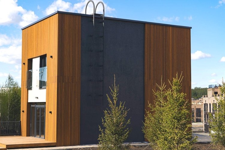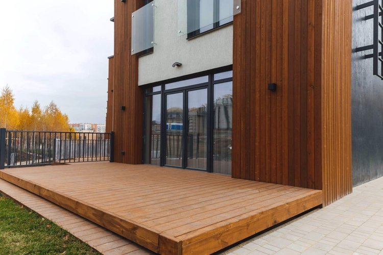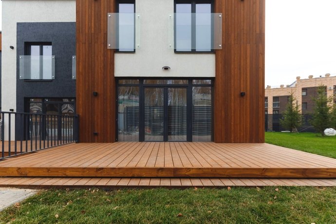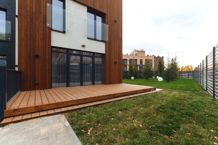 На выходе из гостиной расположена терраса из лиственницы и участок земли, ограниченный невысоким ограждением.