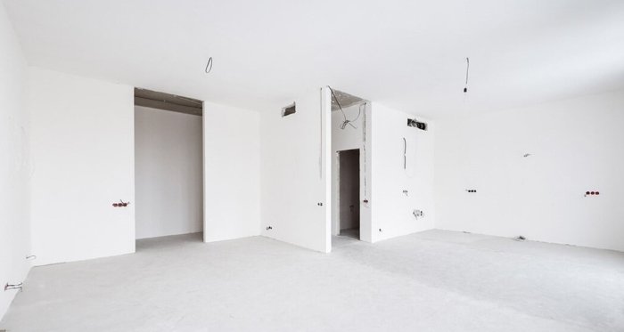Выполнены все черновые работы: проведены коммуникации, выполнена стяжка пола, стены и потолок отшпатлеваны и выровнены.